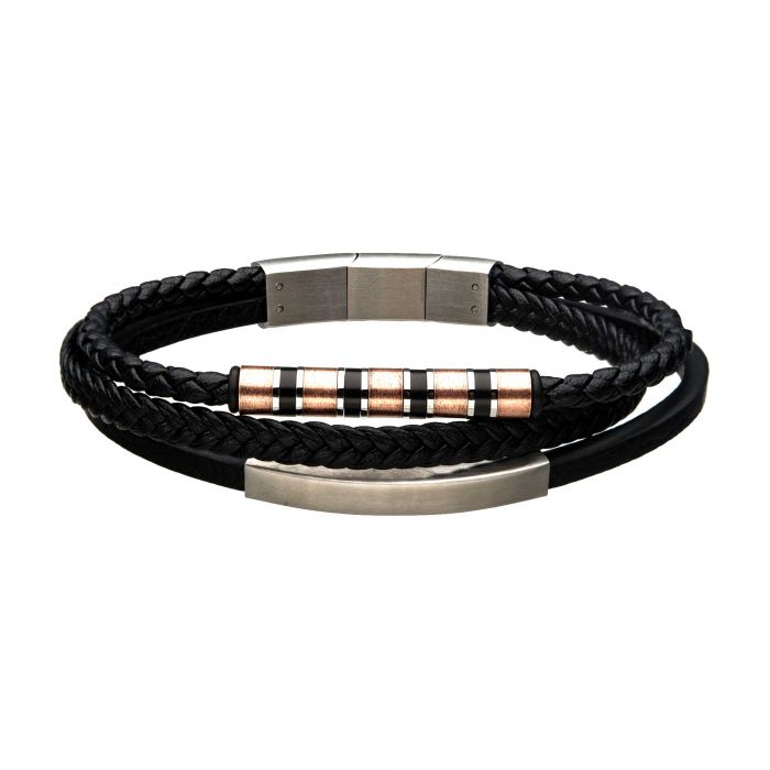 Black leather with rose gold and steel bar bracelet.