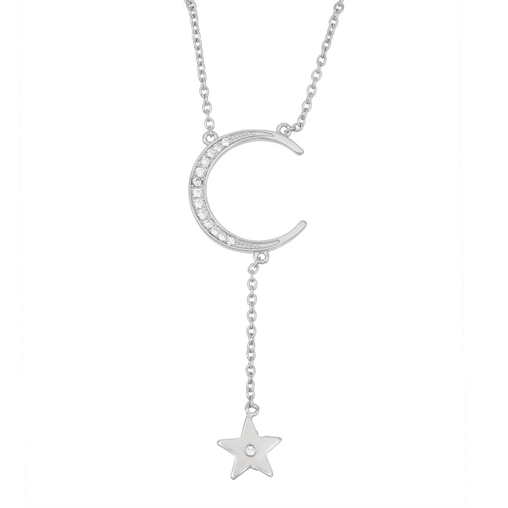 925 Sterling Silver CZ Crescent Moon with Hanging Star Neckalce – 16+2 Inch