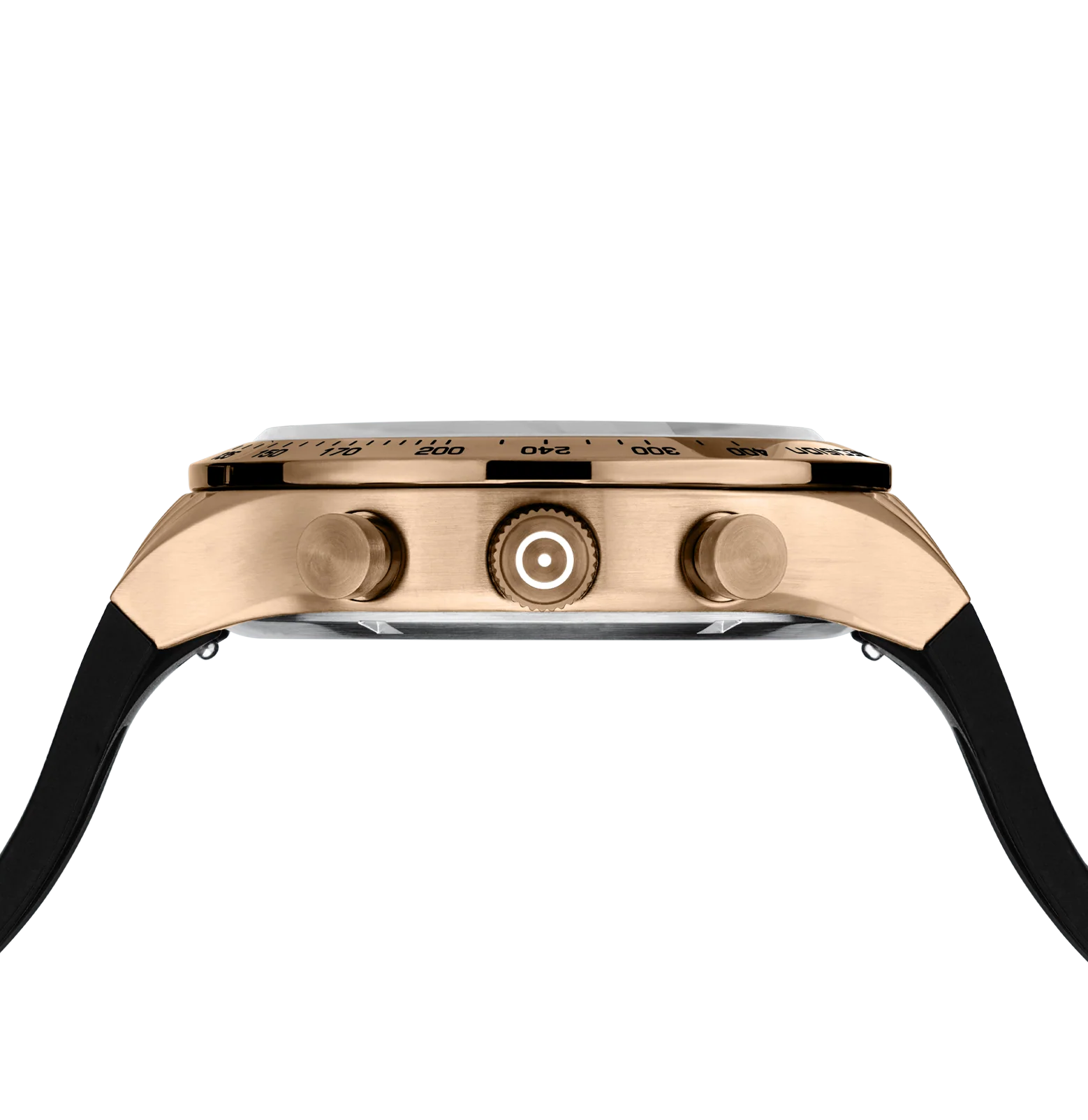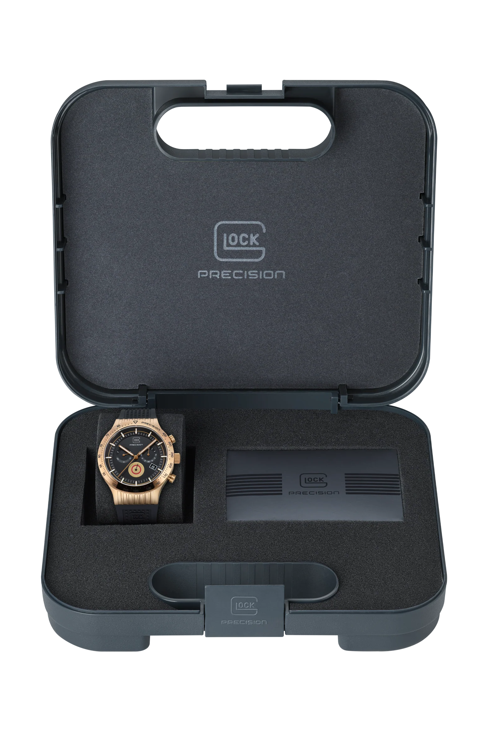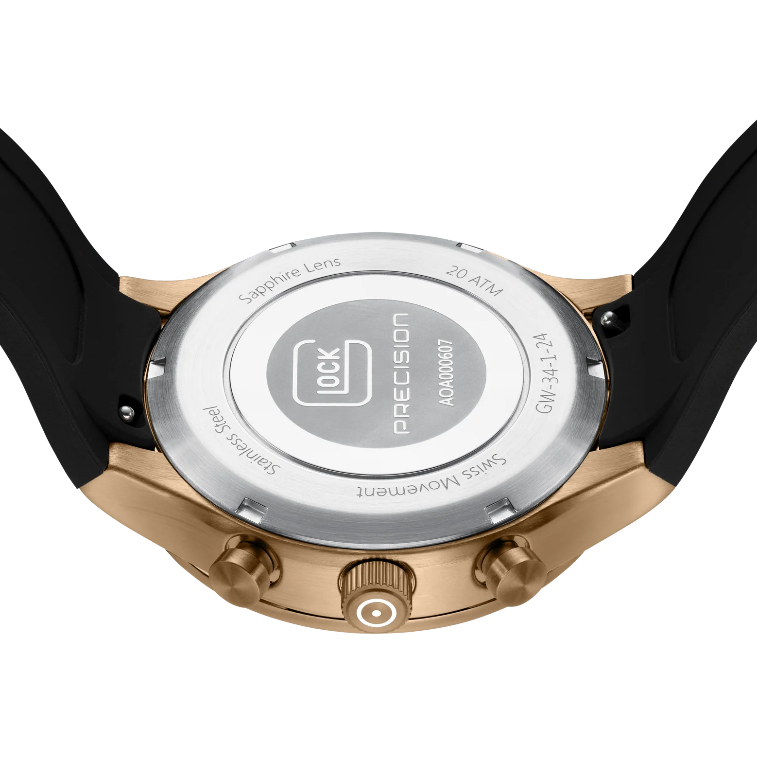 The Glock 43mm coyote stainless steel chronograph watch with a coyote-tone stainless steel case complements a modern, black silicone strap with GLOCK’s RTF texture. The black dial, featuring the distinctive bullet casing detail, displays hands and indices with Swiss Super-LumiNova® for improved readability even in challenging lighting conditions. Driven by a reliable Swiss movement, equipped with a chronograph function, and featuring a 20 ATM water-resistance rating, this watch presents both functionality and style.