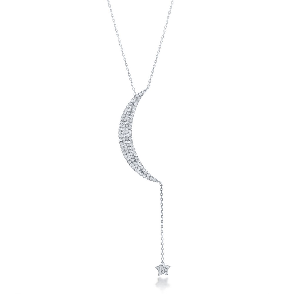 Large CZ Crescent Moon with Dangling Chain and Small Star Necklace